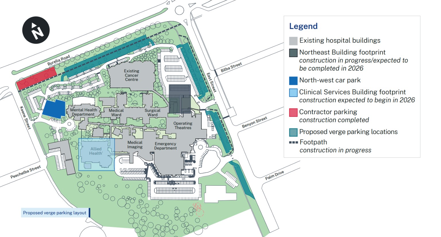 The new permanent verge parking areas will provide more than 200 additional spaces across four locations, improving access for patients, visitors, and staff. These upgrades will also help the hospital run smoothly during major construction, including the new multi-storey Clinical Services Building.