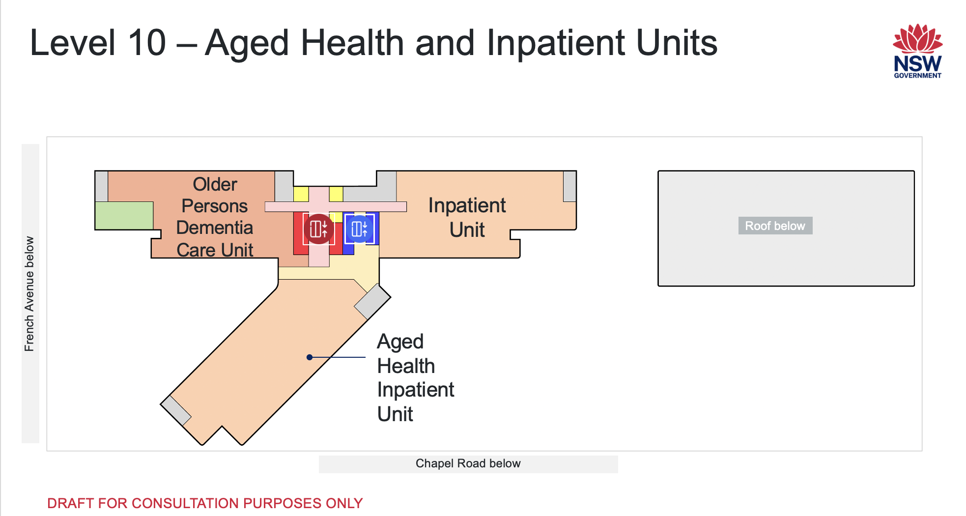 Level 10 includes an Older Persons Dementia Care ward, aged health ward and another inpatient unit for medical or surgical.