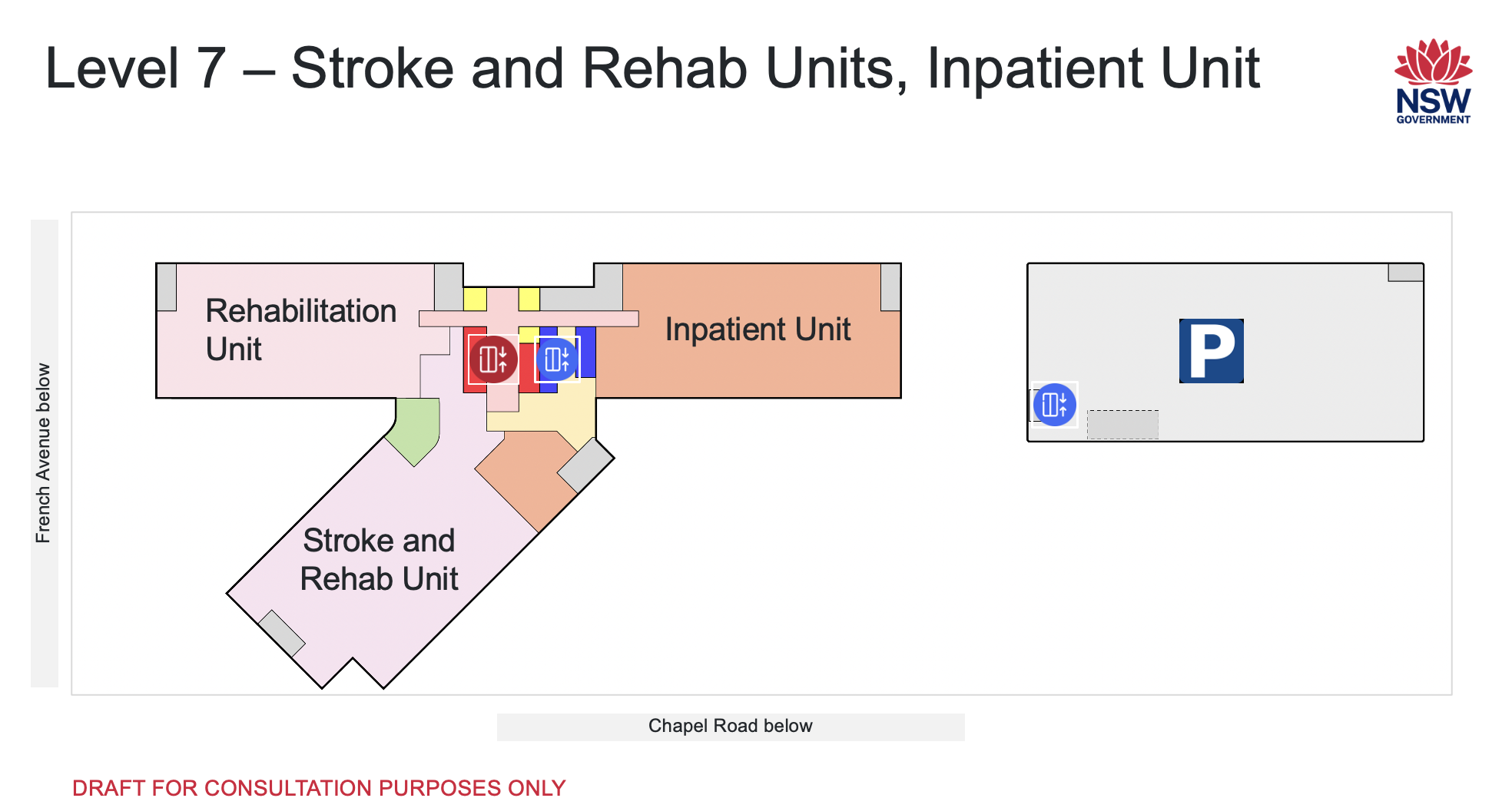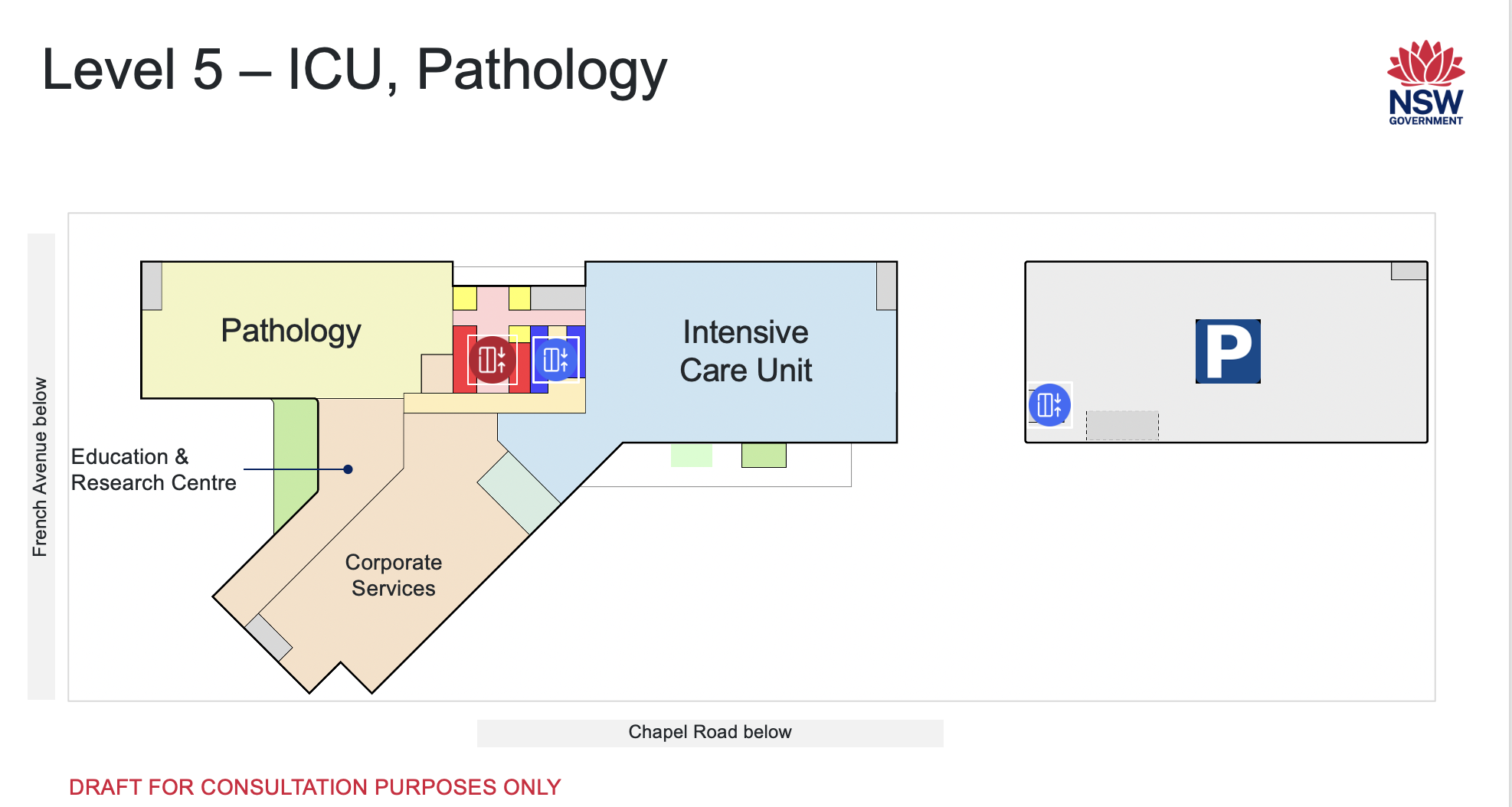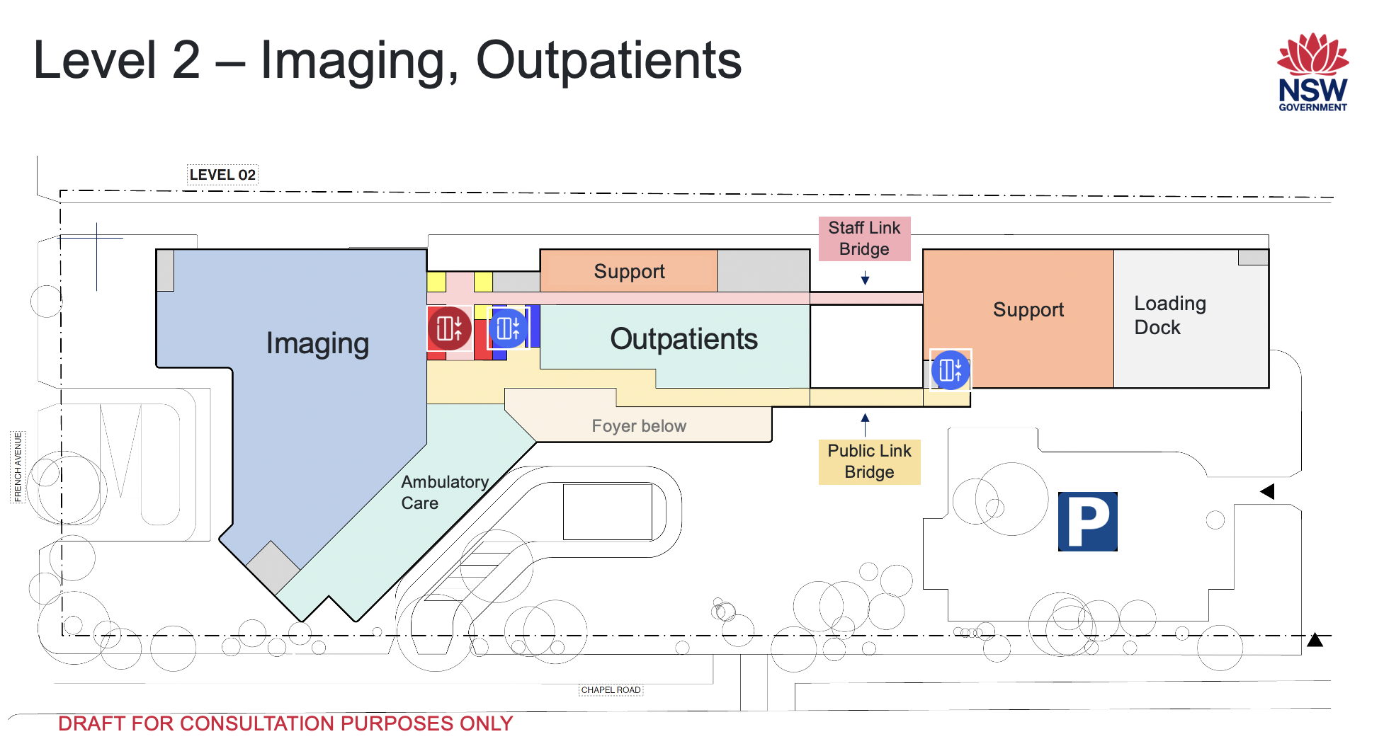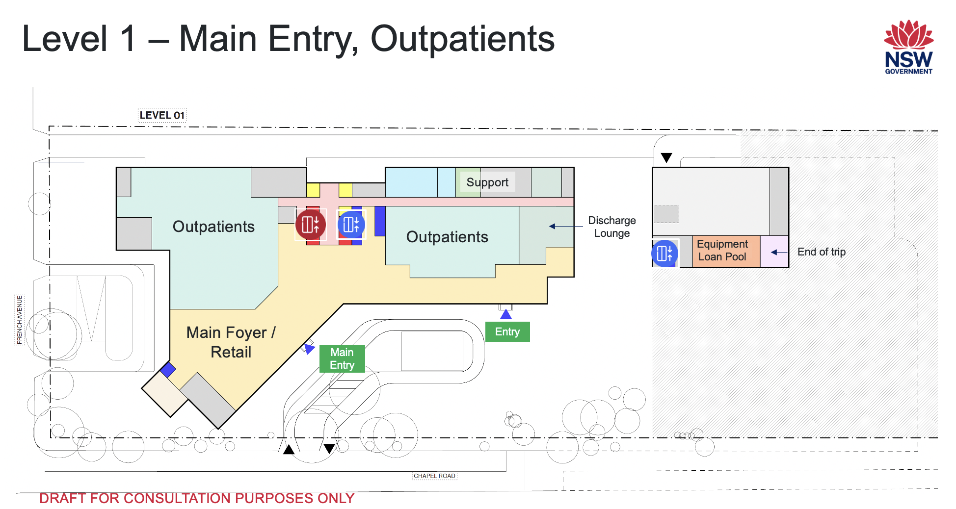 At level 1, there is ground level entry from Chapel Road for easy drop-off and pick-up, especially for people visiting the outpatient clinics on levels 1 or 2.