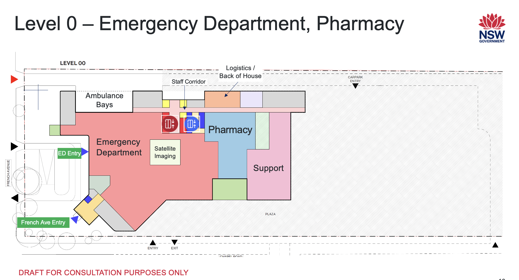 The Emergency Department is at ground level 0 on French Avenue with drop-off and pick-up zones, waiting areas, ambulance bays, security and satellite imaging.