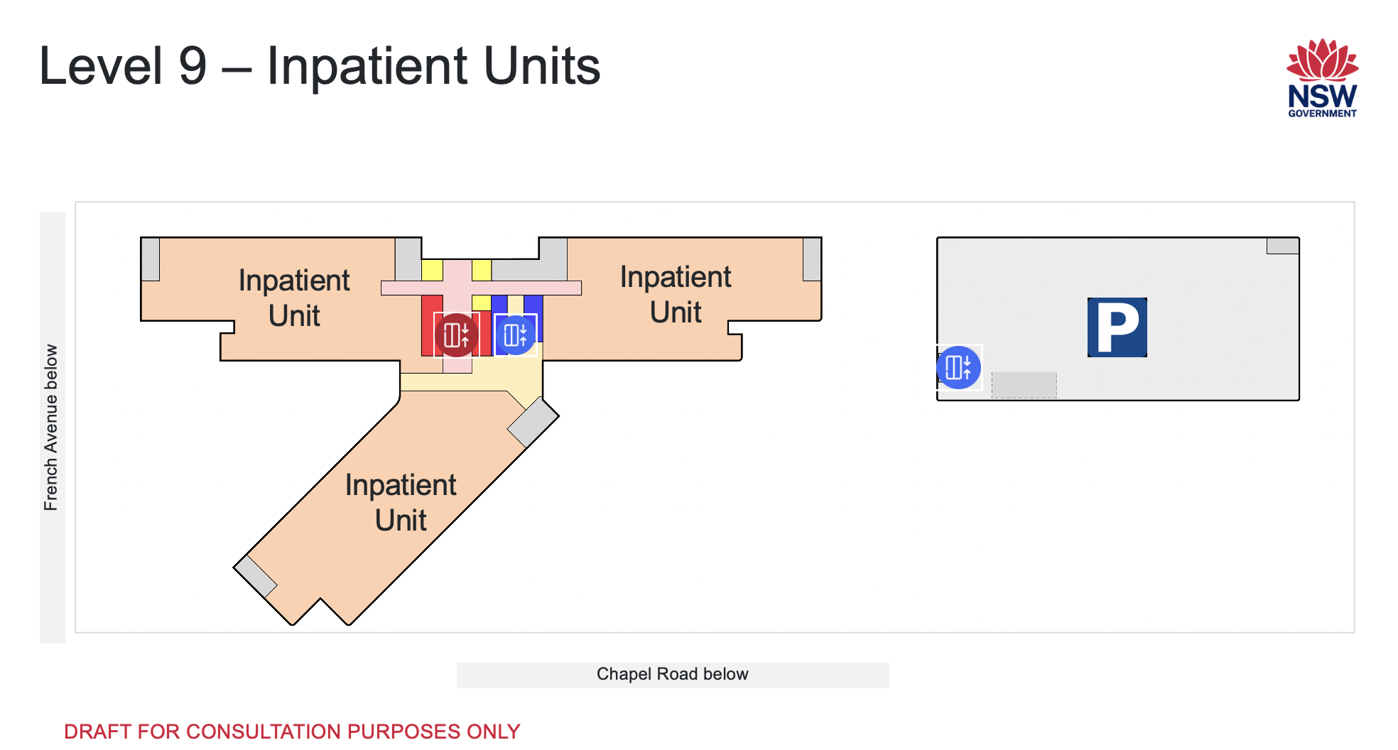 Three patient wards on this level would be for medical or surgical services.