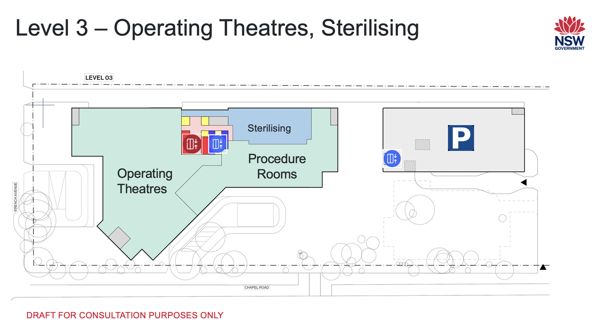 Level 3 will include the operating theatres and procedure rooms for surgical services, supported by Sterilising Services.